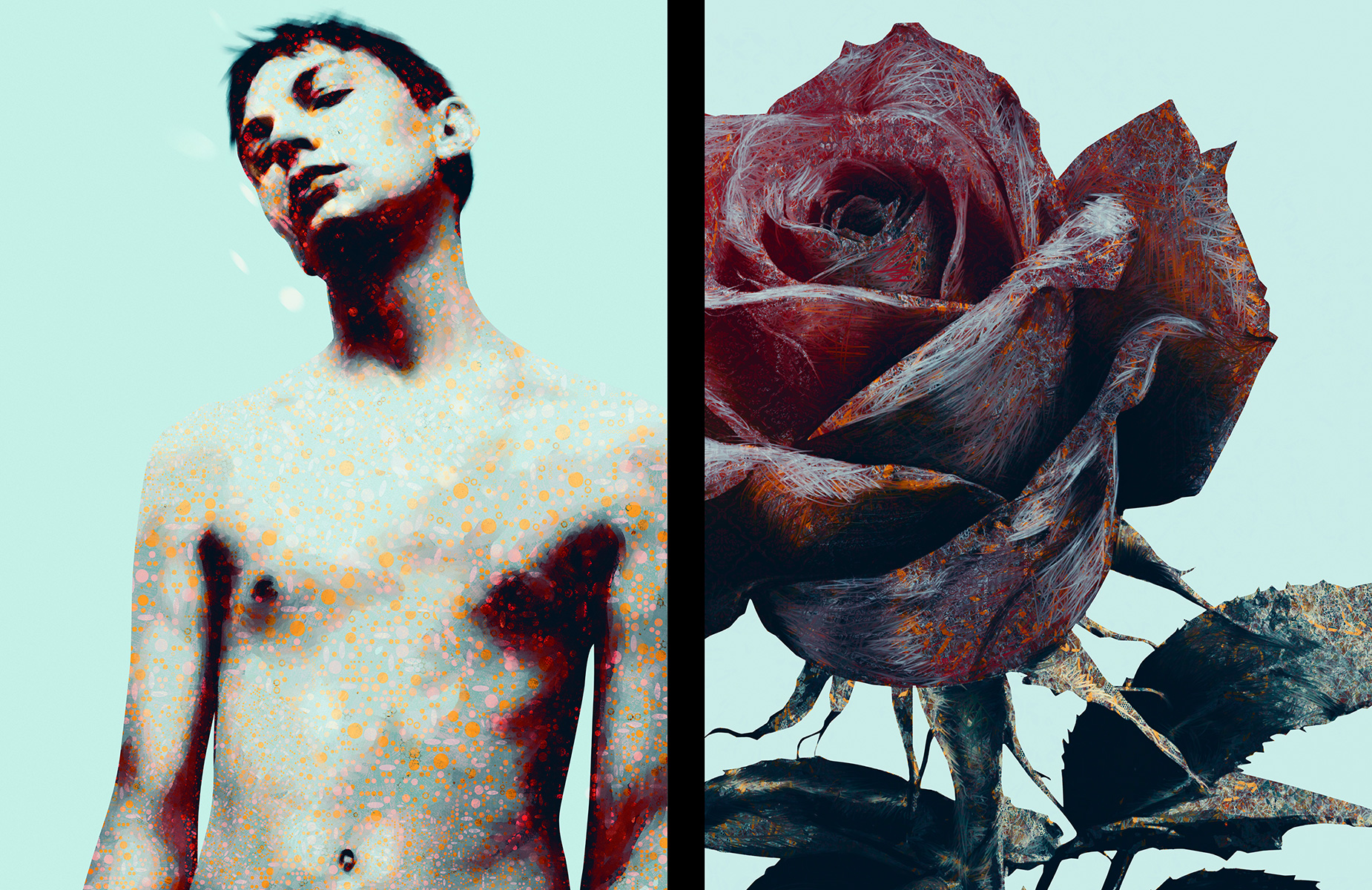 In der Reihe „Caro Rosa“ (lat. „das teure Fleisch“ / „die geliebte Rose“) begegnen sich männliche Nacktheit und florale Sinnlichkeit in einem präzise komponierten Dialog – dargestellt in Diptychen, bei denen jeweils ein homoerotisches Selbstporträt einem Rosendetail gegenübergestellt wird. Die linke Seite zeigt mich. Die rechte Seite zeigt eine einzelne Rose in extremer Nahaufnahme – feucht, leuchtend, üppig oder welk.
