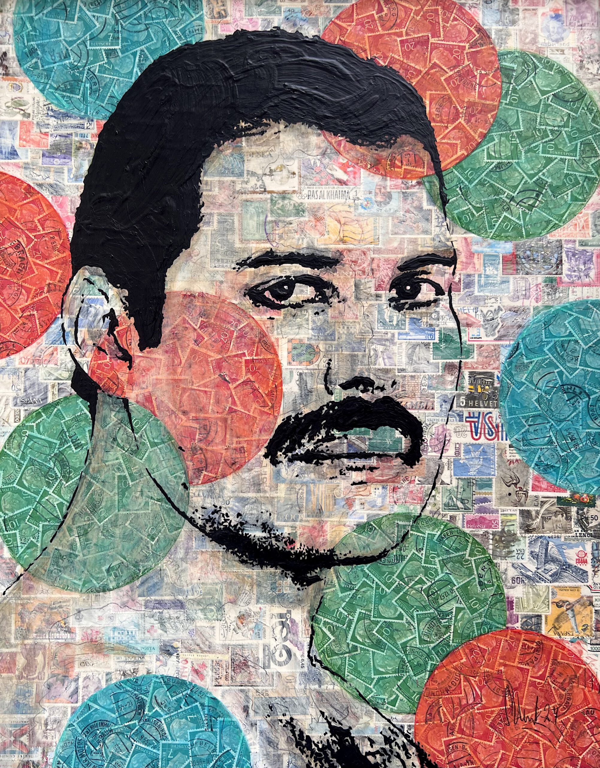 | Material | Acryl- und Aquarellfarbe auf Collage aus originalen Briefmarken |
