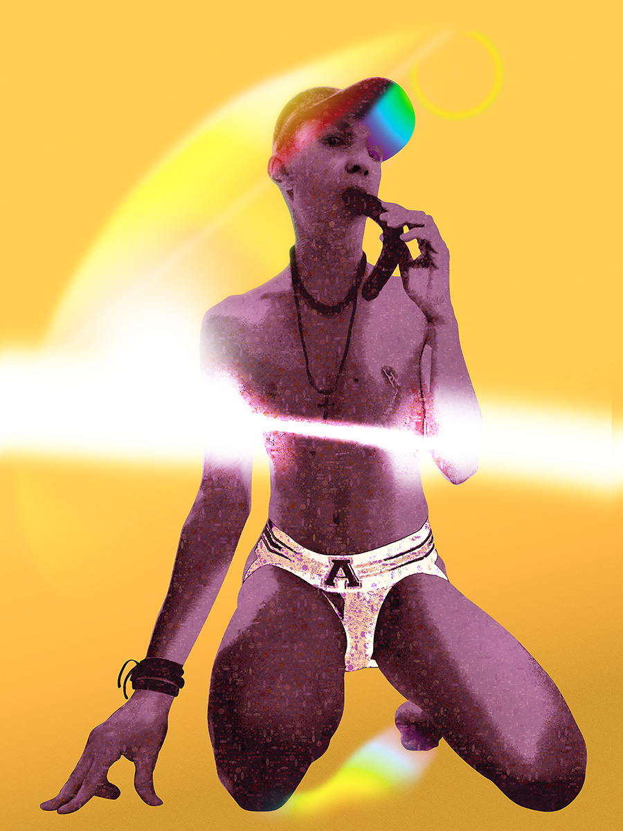 „Golden Vice“ (dt. etwa: „goldenes Laster“ oder „goldene Versuchung“) ist ein großformatiges Selbstporträt, das mit einer kraftvollen Mischung aus Fetischästhetik, Körperinszenierung und farblicher Überhöhung arbeitet. Das Bild lebt von seiner Spannung: Zwischen Enthüllung und Verdeckung, zwischen Dominanz und Hingabe, zwischen Fleisch und Licht.
