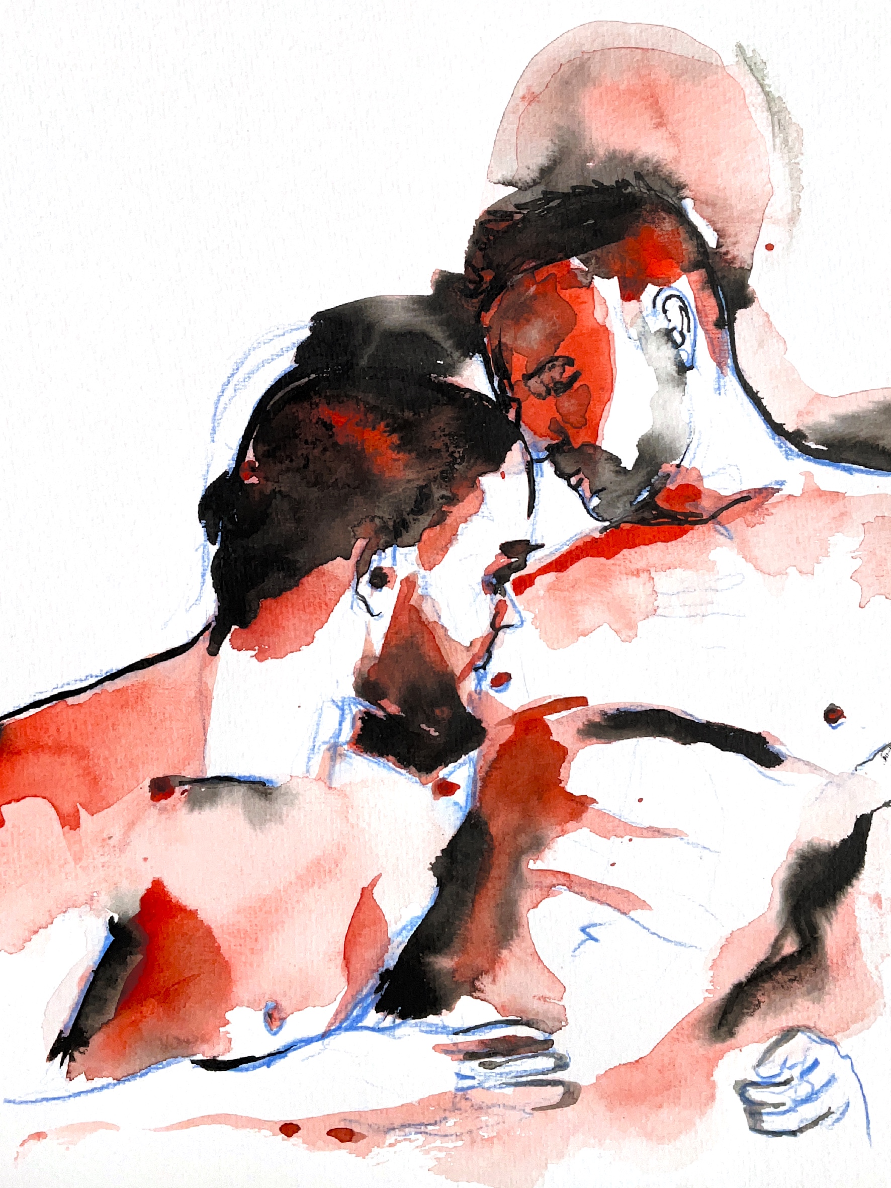 Two men kissing. The intensity of it is shown by the bright red, color of love, agressivity and blood.