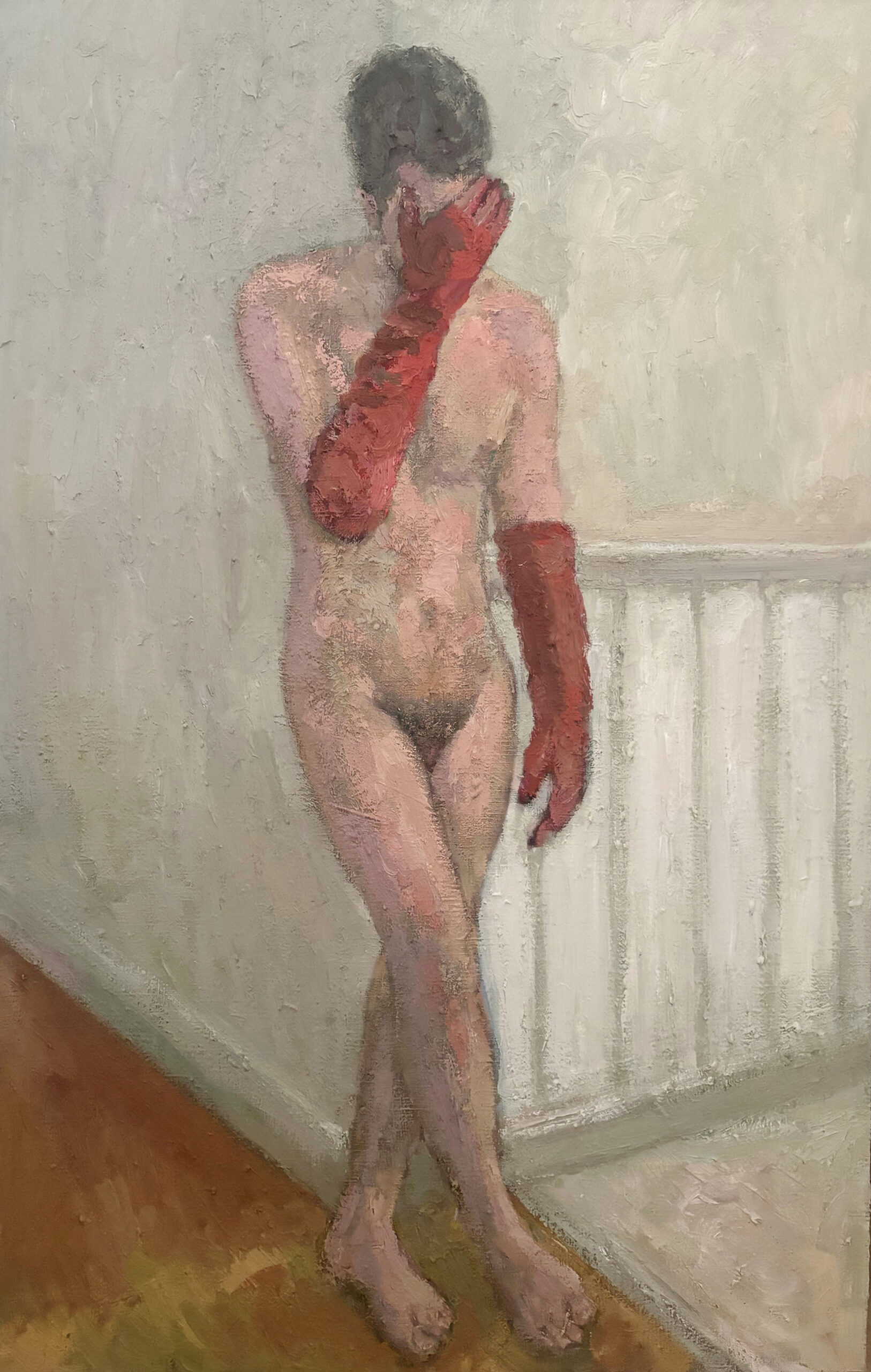 Das Werk zeigt einen jungen Mann mit roten Handschuhen, beim Tucken.