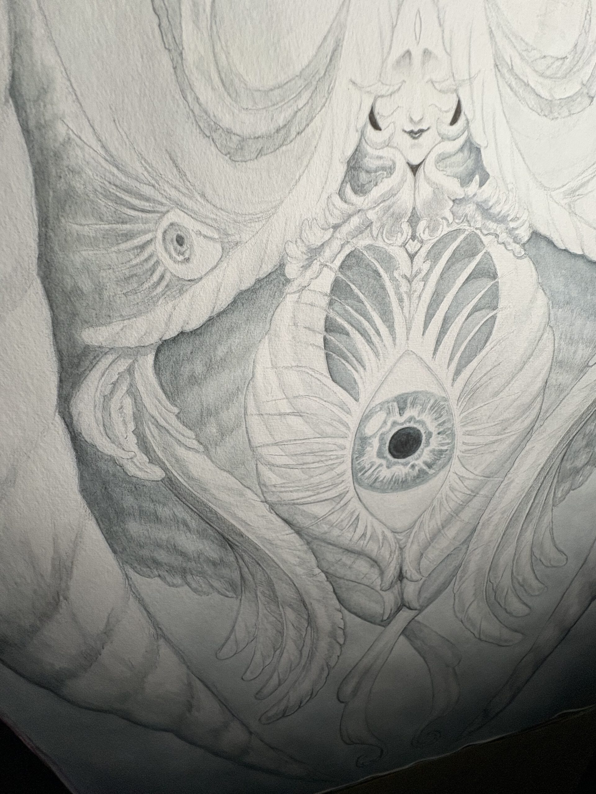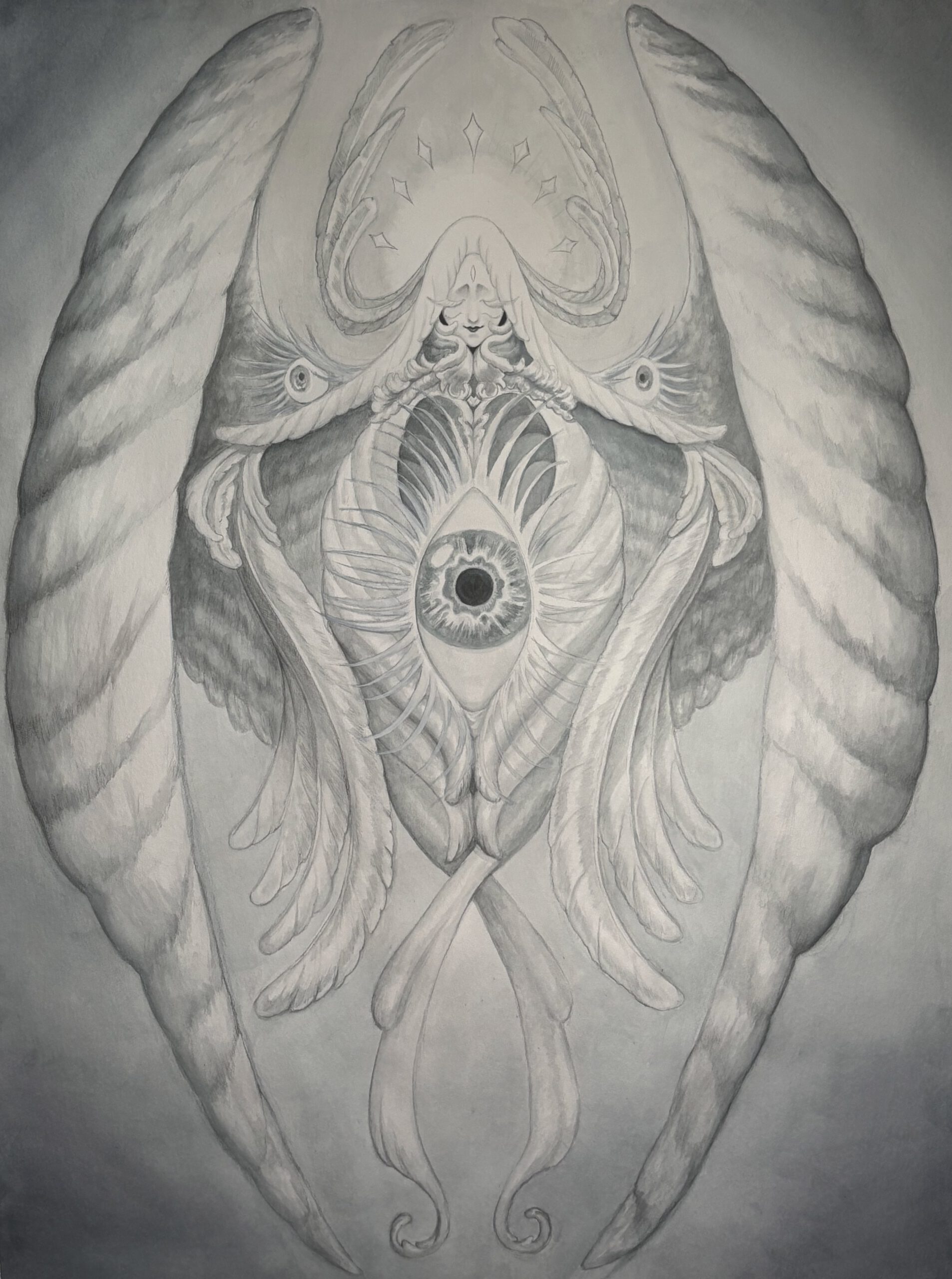 Eine Variation von Biblically accurate angel oder Biblisch korrekter Engel. Tusche und Aquarell auf Papier.